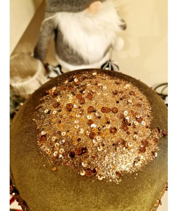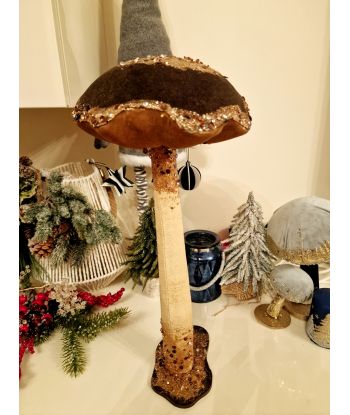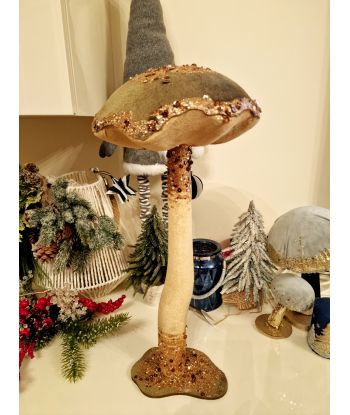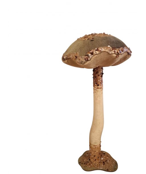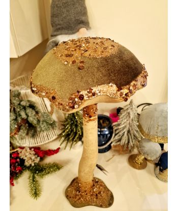 Grzyb wykonany z weluru w zielonym kolorze, ozdobiony brokatem, to stylowy element dekoracyjny, który doda charakteru każdemu wnętrzu. O wysokości 51 cm, grzyb doskonale nadaje się do wyeksponowania na półkach, stołach czy w donicach.