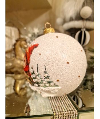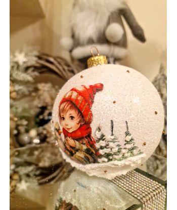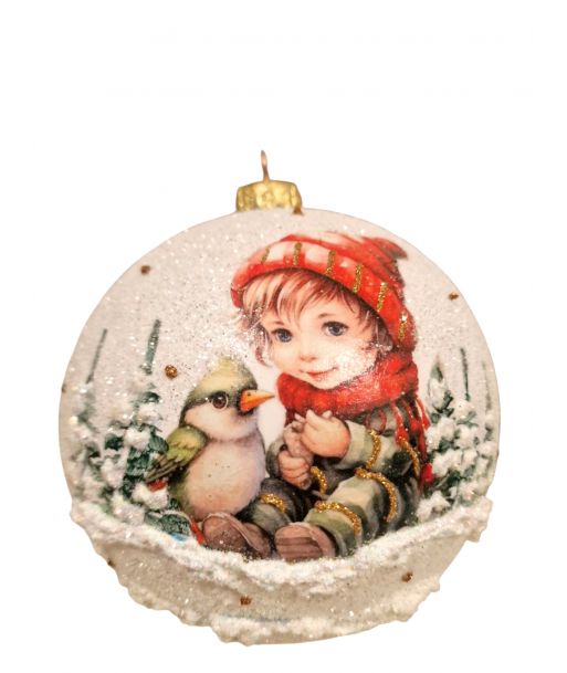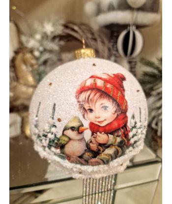 OZDOBA ŚWIĄTECZNA - DUŻA BOMBKA 120 mm DECOUPAGE DZIECI - chłopczyk z ptaszkiem