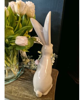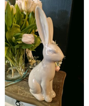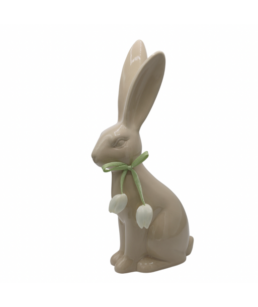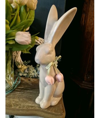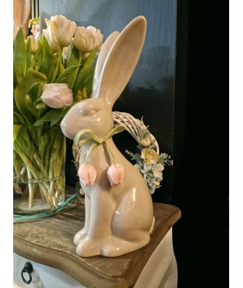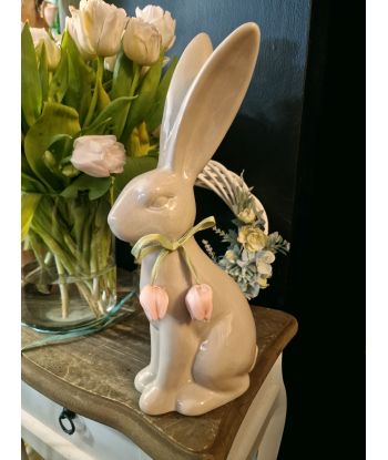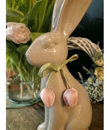 FIGURA CERAMICZNA - SIEDZĄCY KRÓLIK ZAJĄC Z TULIPANAMI beż