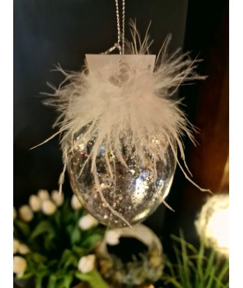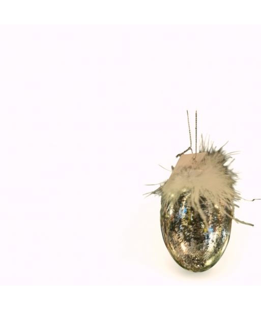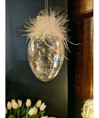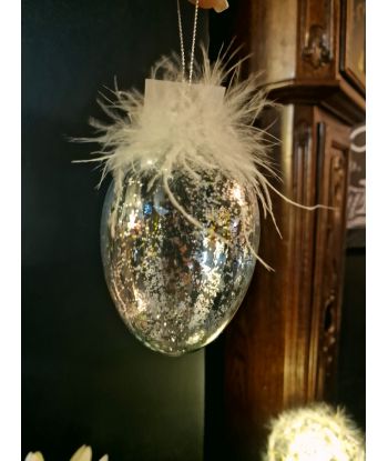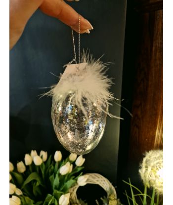 Dodaj odrobinę blasku i elegancji do swojego wnętrza dzięki temu wyjątkowemu szklanemu jajku dekoracyjnemu. Starannie wykonane, zachwyca delikatnym połyskiem brokatu oraz subtelnymi piórkami, które nadają mu lekkości i niepowtarzalnego charakteru.
